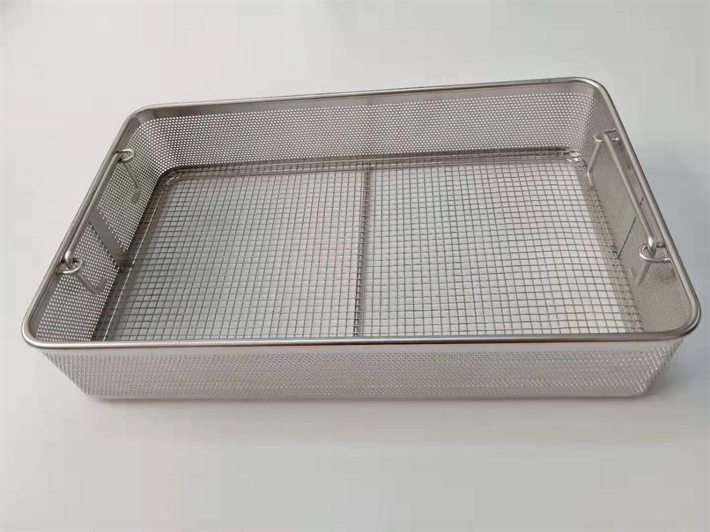 安平县正丰金属丝网制品厂主营消毒筐,网筐网篮,不锈钢网筐,不锈钢网篮,医用网筐,清洗篮筐,内窥镜专用篮,风机罩,冲孔网,等丝网深加工产品,现又研发出包角消毒筐和底部是不锈钢编织网侧面是冲孔网的消毒筐,与普能消毒筐相比它的特点是,