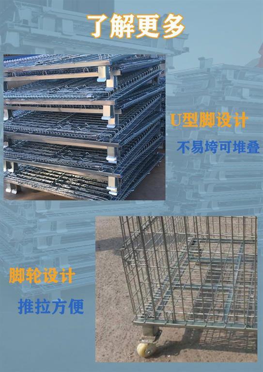 又称折叠周转箱都是采用采用全新料,U型脚设备,不易垮塌,可以堆叠,节省空间。科学的脚轮设备,移动方便,我厂支持定做多种尺寸的仓储笼。